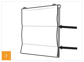 Látku sundejte z konzole (je připevněna na suchý zip). Rozvažte šňůrky a poznačte si výšku, kde musíte rolety opět přivázat